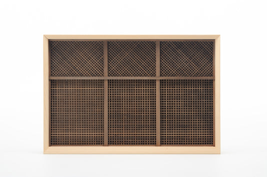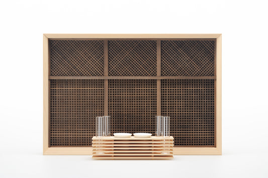 三祀御社の面格子。その精緻なデザインを実現するため多くの職人に声をかけました。しかし返事はすべて「できない」。2ミリ幅の細い木材を上部は3ミリ間隔で、下部は4ミリの間隔で組んでいくことはごく一握りの職人にしかできない高度な技術だったのです。しかも今回は硬質で加工の難しい神代木が、その風合いからデザイナーの強い要望で選ばれています。この面格子が実現できたのはひとえに横田氏の卓越した組子の技によるものです。社寺や城郭など文化財の修復を多く手掛けるかたわら、現代の暮らしの中でも組子の美しさを感じてほしいという氏の想いが新しい神棚の意匠として実現しました。