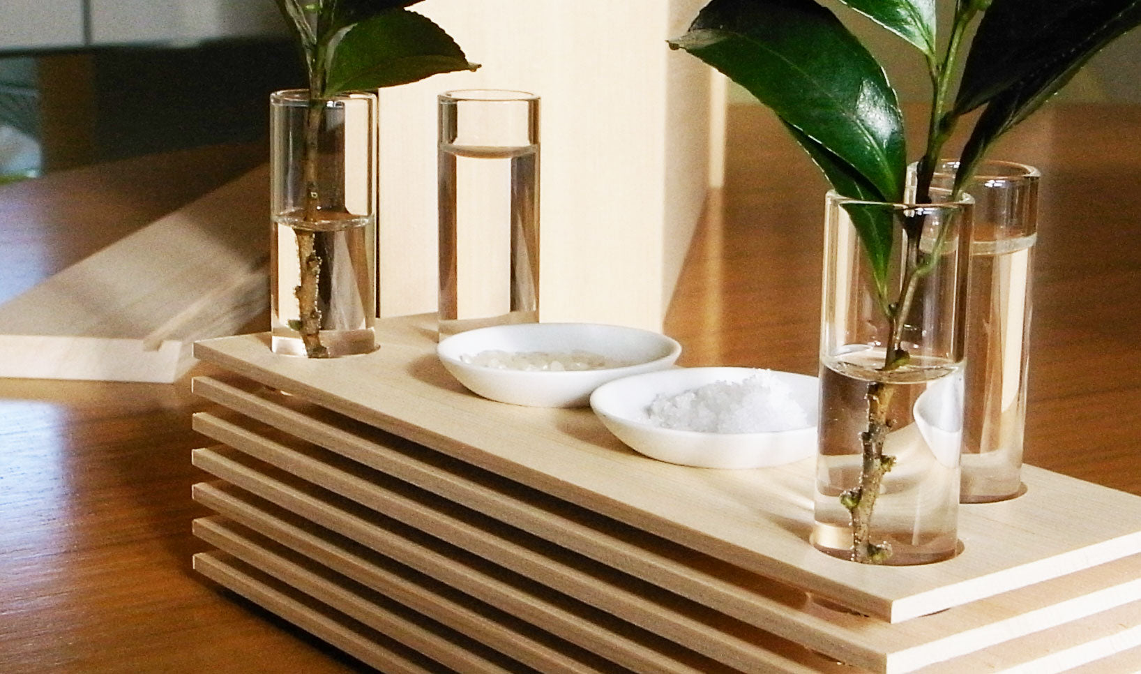 見た目の形が変わることで、神さまをおまつりすることがおろそかになってはいけません。現代の住空間に合わせたデザインでも神棚本来の意味を保ち続け、それを新しい伝統として次の世代に継承していくべきだと私たちは考えます。神社建築の様式美を引き継ぐ神棚の考え方はそのままに、形を変えて表現する。神宮司神棚舎の神棚がまったく新しい形ながら、穏やかで落ち着いた「神棚らしさ」を合わせ持つ理由です。